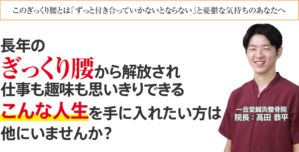 もしあなたが今、上記のようにお悩みなら、ほんの少しでも心のどこかで良くなりたい!と思われているなら、一会堂鍼灸整骨院に来院し、そのつらいぎっくり腰を根本から改善しませんか?