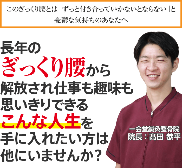 あなたもこのままつらいぎっくり腰を持ったまま過ごしていきますか?私はあなたの不安をすべて取り除きました。「つらいぎっくり腰を取り除き、仕事も趣味も思いっきりやりたい!」というあなたのご来院をお待ちしております。