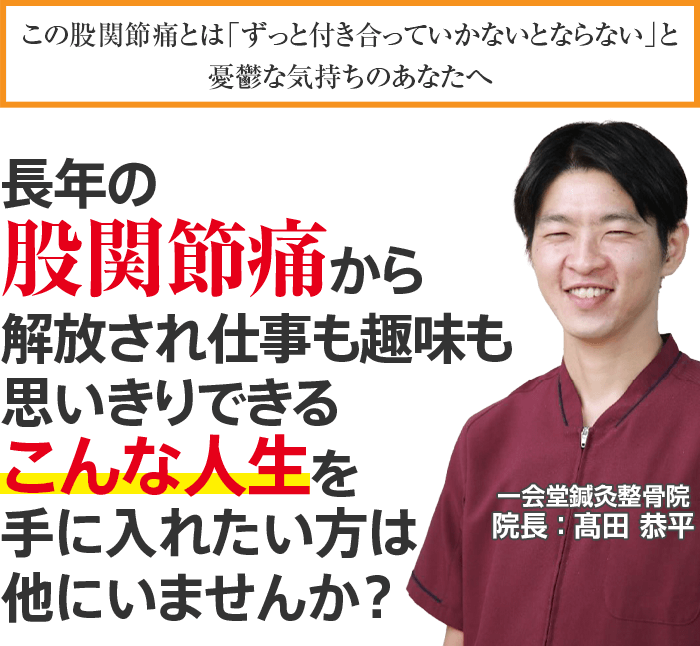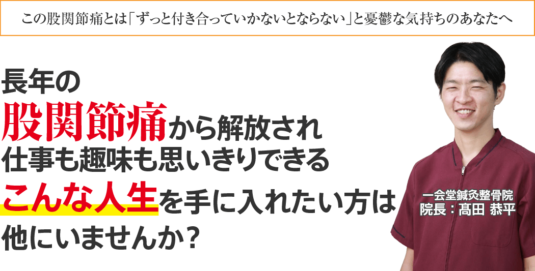 もしあなたが今、上記のようにお悩みなら、ほんの少しでも心のどこかで良くなりたい!と思われているなら、一会堂鍼灸整骨院に来院し、そのつらい股関節痛を根本から改善しませんか?